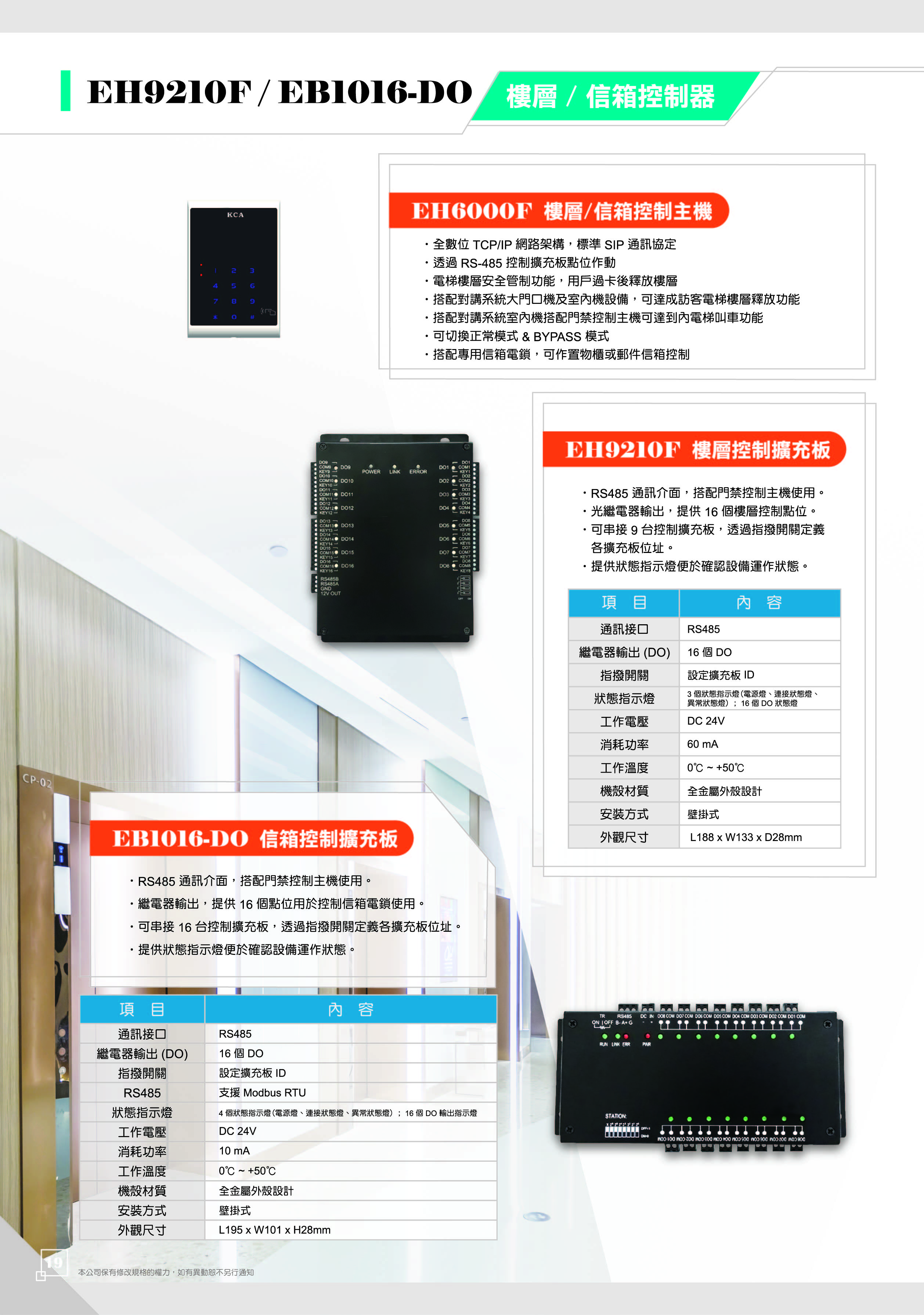 首頁●產品專區●最新活動●本月促銷●●樓層/信箱控制主機 EH-6000F 樓層/信箱控制主機‧全數位 TCP / IP 網路架構,標準 SIP 通訊協定 ‧透過 RS-485 控制擴充板點位作動 ‧電梯樓層安全管制功能,用戶過卡後釋放樓層 ‧搭配對講系統大門口機及室內機設備,可達成訪客電梯樓層釋放功能 ‧搭配對講系統室內機搭配門禁控制主機可達到內電梯叫車功能 ‧可切換正常模式 & BYPASS 模式 ‧搭配專用信箱電鎖,可作置物櫃或郵件信箱控制 價格:NT (登入後才能看到價格) 目錄下載: 目錄 1