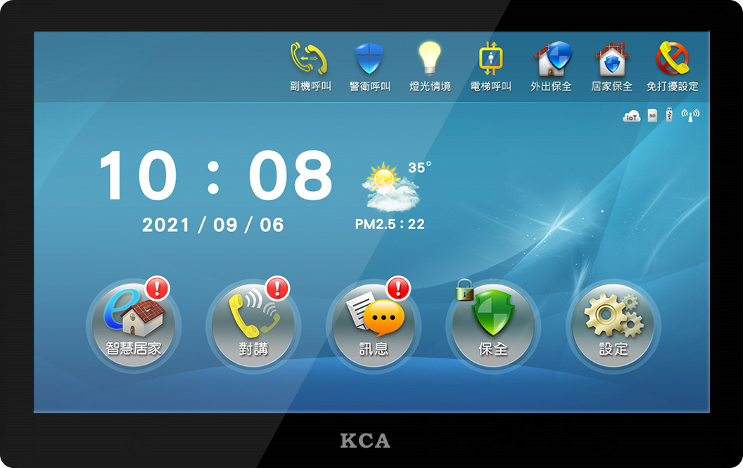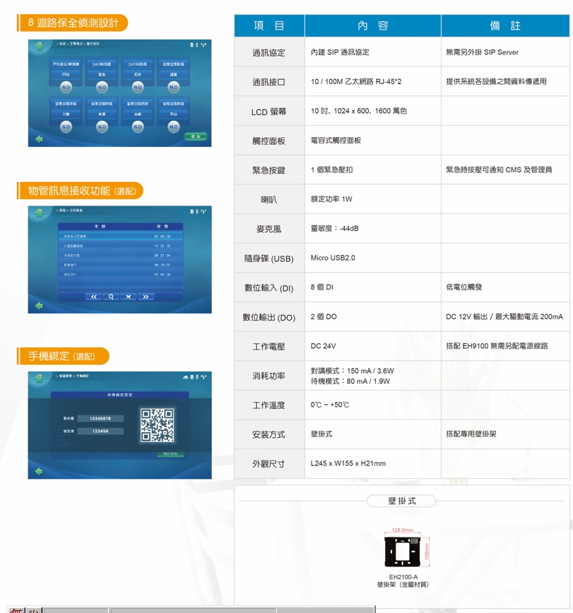 10吋 首頁●產品專區●智慧對講系統●室內機系列●10吋●10.1吋觸控保全室內機 EH-2500 10.1吋觸控保全室內機功能說明: ‧全數位TCP / IP網路架構,標準SIP通訊協定 ‧10.1吋全觸控螢幕及提示功能操作 ‧即時影音對講,支援 H.264 影像壓縮技術與 G.711 聲音壓縮技術及硬體 Echo抑制,以達到最佳影音效果 ‧紅色實體緊急按鈕設計,顏色鮮明且可降低誤觸風險 ‧具來電辨識,可針對不同設備來電設定不同鈴聲 ‧具戶戶對講功能 ‧可作全天免打擾、限時免打擾及正常接聽模式設定 ‧內建 8 個 DI 保全迴路,當迴路觸發會通知 CMS 管理系統及管理機, 本機同時發出警報音 ‧內建 2 個 DO 迴路,可作 DI/O 連動設定 ‧訪客呼叫建立通話時,可遠端搖控玄關大門口機、住戶門口機開門, 並顯示門位狀態 ‧具有來電、撥號等通話紀錄可查詢 ‧可監看玄關大門口機、住戶門口機、特定攝影機即時串流等 ‧搭配電梯樓層控制器可達到電梯叫車功能 ‧可接收 CMS 之當地天氣、時間、日期等生活資訊與社區公告訊息(選配) ‧透過 CMS 可遠端進行設備設定、程式升級及維護作業 ‧支援 KCA Cloud 功能,配合手機 APP 即時推播警報訊號, 查看保全迴路狀態、情境控制等功能(選配) 價格:NT (登入後才能看到價格)