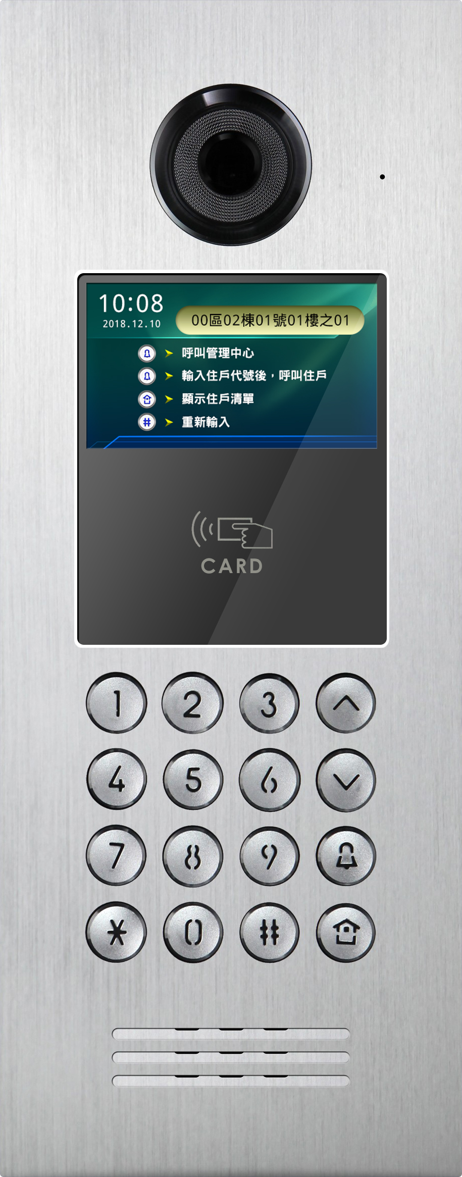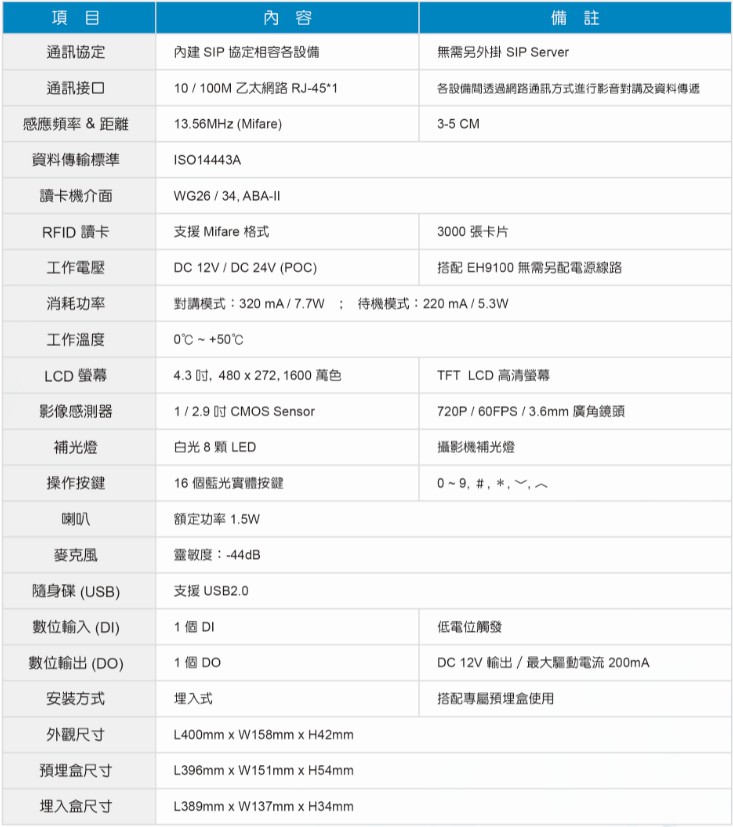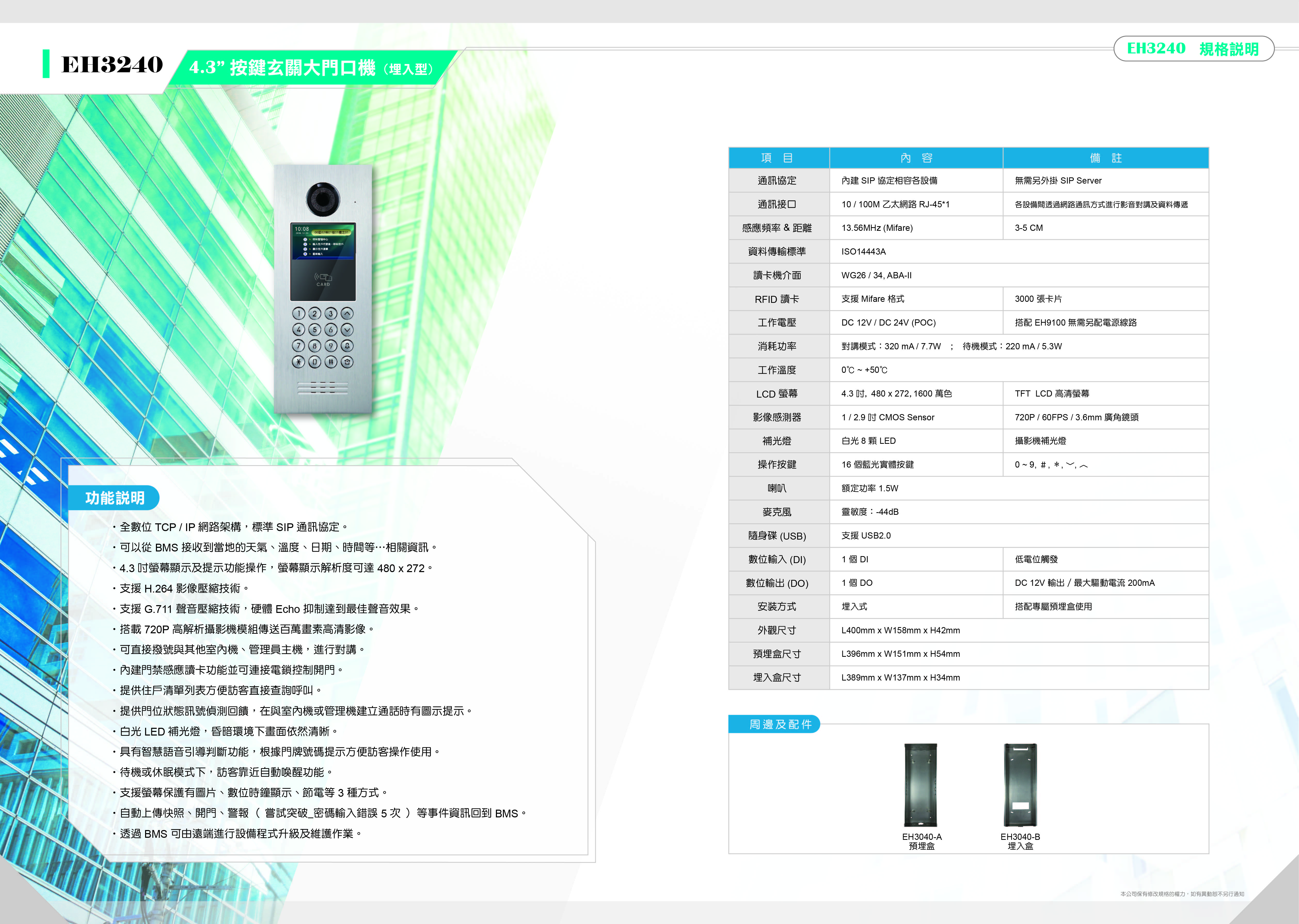 玄關門口機 首頁●產品專區●智慧對講系統●門口機系列●玄關門口機●4.3吋按鍵玄關大門口機 EH-3240 4.3吋按鍵玄關大門口機功能說明: 全數位 TCP/IP 網路架構,標準 SIP 通訊協定 可以從 CMS 接收到當地的天氣、溫度、日期、時間等…相關資訊 4.3 吋電容式觸控螢幕功能操作,螢幕顯示解析度可達 480 x 272 支援 H.264 影像壓縮技術 支援 G.711 聲音壓縮技術,硬體 Echo 控制達到最佳聲音效果 搭載 720P 高解析攝影機模組傳送百萬畫素高清影像 可直接撥號與其他室內機、管理員主機,進行對講 內建門禁感應讀卡功能並可連接電鎖控制開門 提供住戶清單列表方便訪客直接查詢呼叫 提供門位狀態訊號偵測回饋,在與室內機或管理機建立通話時有圖示提示 白光 LED 補光燈,昏暗環境下畫面依然清晰 具有智慧語音引導功能,根據門牌號碼提示方便訪客操作使用 支援螢幕保護有圖片、數位時鐘顯示、節電等 3 種方式 自動上傳快照、開門、警報 ( 嘗試突破_密碼輸入錯誤 5 次 ) 等事件資訊回到 CMS 透過 CMS 可由遠端進行設備程式升級及維護作業 價格:NT (登入後才能看到價格) 目錄下載: 目錄 1