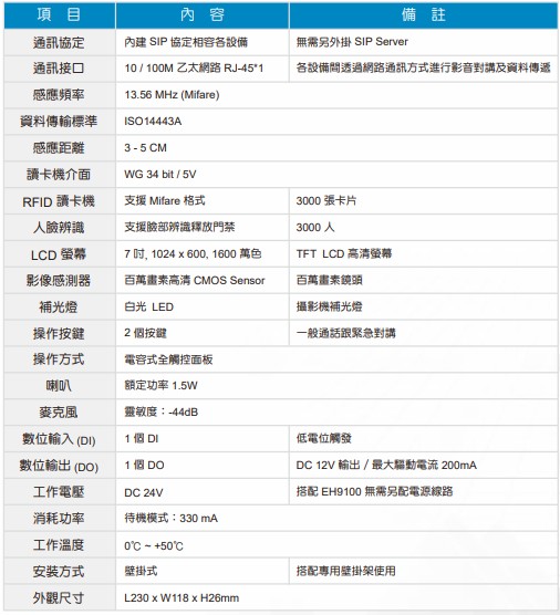緊急對講機 首頁●產品專區●智慧對講系統●門口機系列●緊急對講機●7吋網路型緊急對講機(臉辨) EH1070A 7吋網路型緊急對講機(臉辨) 產品特性 ‧全數位 TCP / IP 網路架構,標準 SIP 通訊協定 ‧支援e 家管APP QR Code 辨識解鎖功能 ‧支援G7.11 聲音壓縮技術及硬體Echo抑制,達到最佳聲音效果 ‧支援H.264 影像壓縮技術 ‧7吋全觸控螢幕顯示及提示功能操作,螢幕顯示解析度可達1024x600 ‧可直接呼叫管理員主機進行對講 ‧可以從 CMS接受到日期、時間等...相關資訊 ‧支援人臉辨識及門禁感應讀卡功能,並可連接電鎖控制開門 ‧提供門位狀態訊號偵測回饋 ‧3D 結構光辨識技術 ‧白光LED 補光燈,昏暗環境下可提升照度 . 支援螢幕保護數位時鐘顯示 ‧自動上傳快照、開門、警報等事件資訊回到 CMS ‧透過 CMS 可由遠端進行設備程式升級及維護作業 價格:NT (登入後才能看到價格)